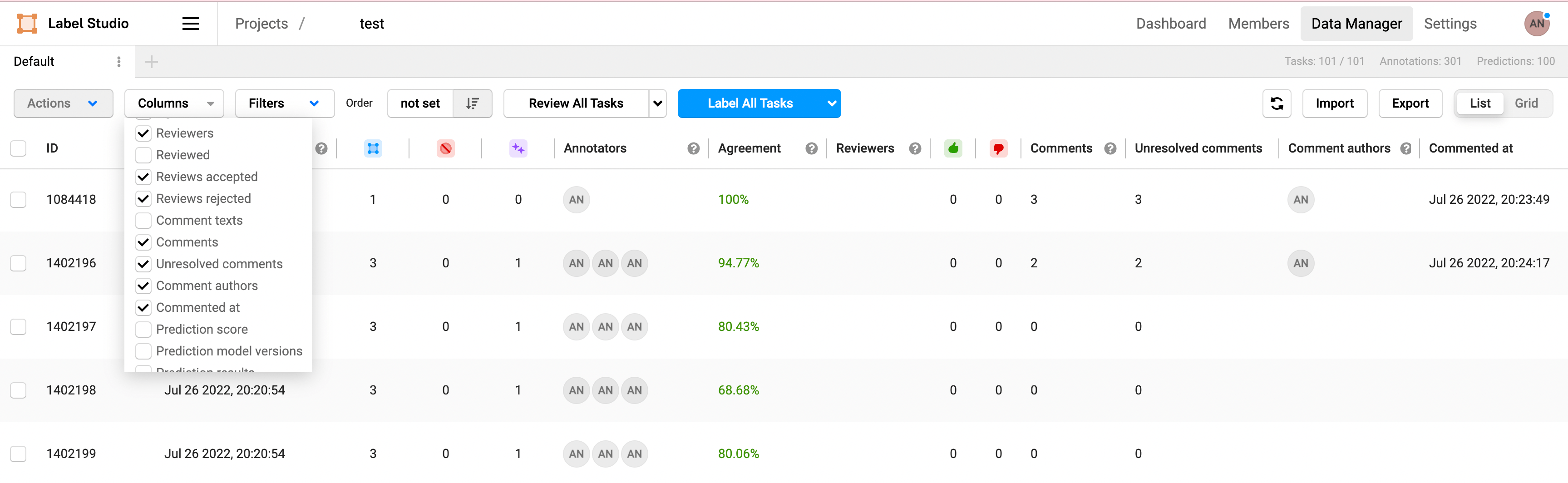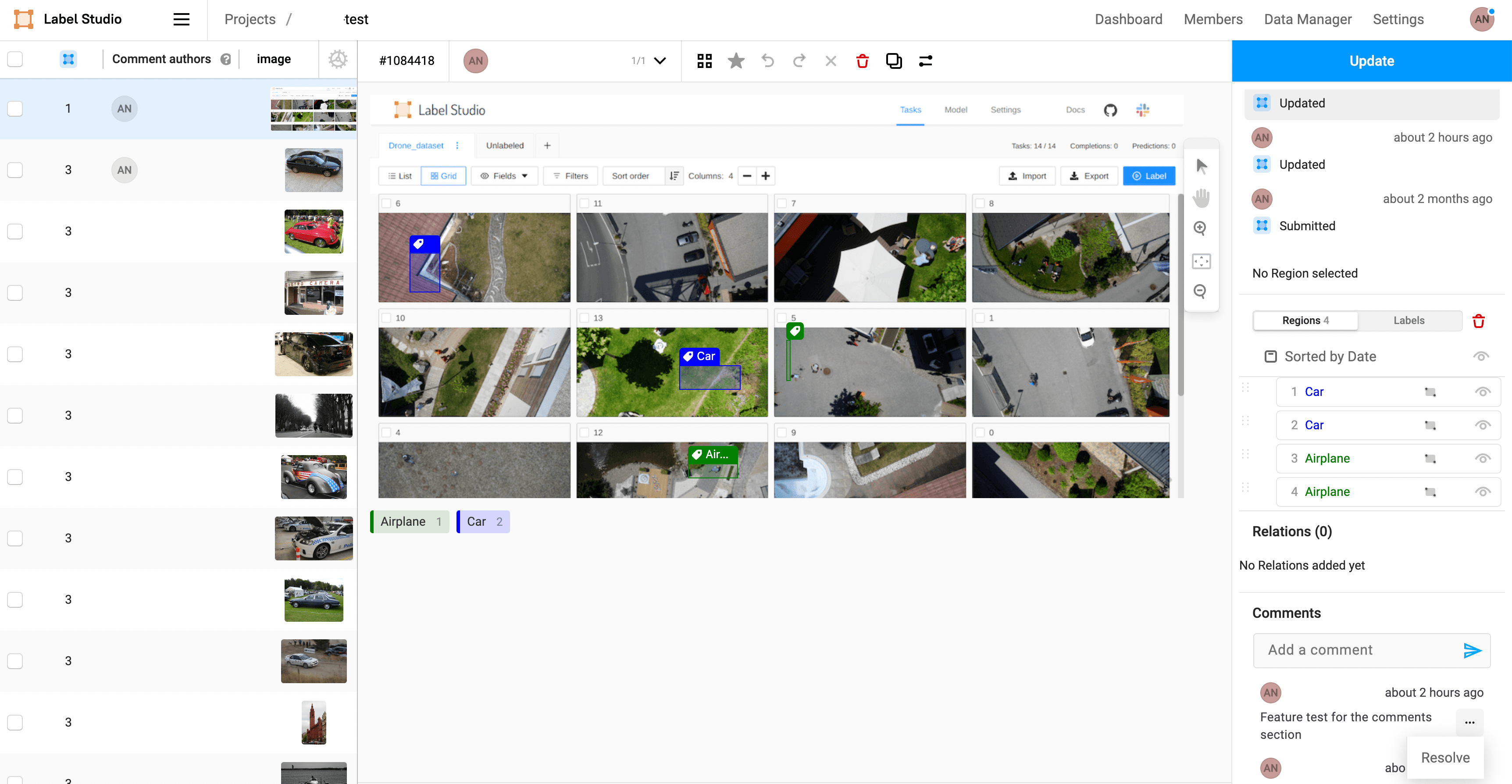 The Comments feature allows Annotators Reviewers and other higher roles to communicate and discuss queries on Label Studio Enterprise. Users will be notified of comments if they are associated with the task, and new comments will show up in the Notifications panel for a quick reference. Users can also filter and sort tasks by Comments status in the Data Manager view, such as finding tasks with unresolved comments from a particular user.