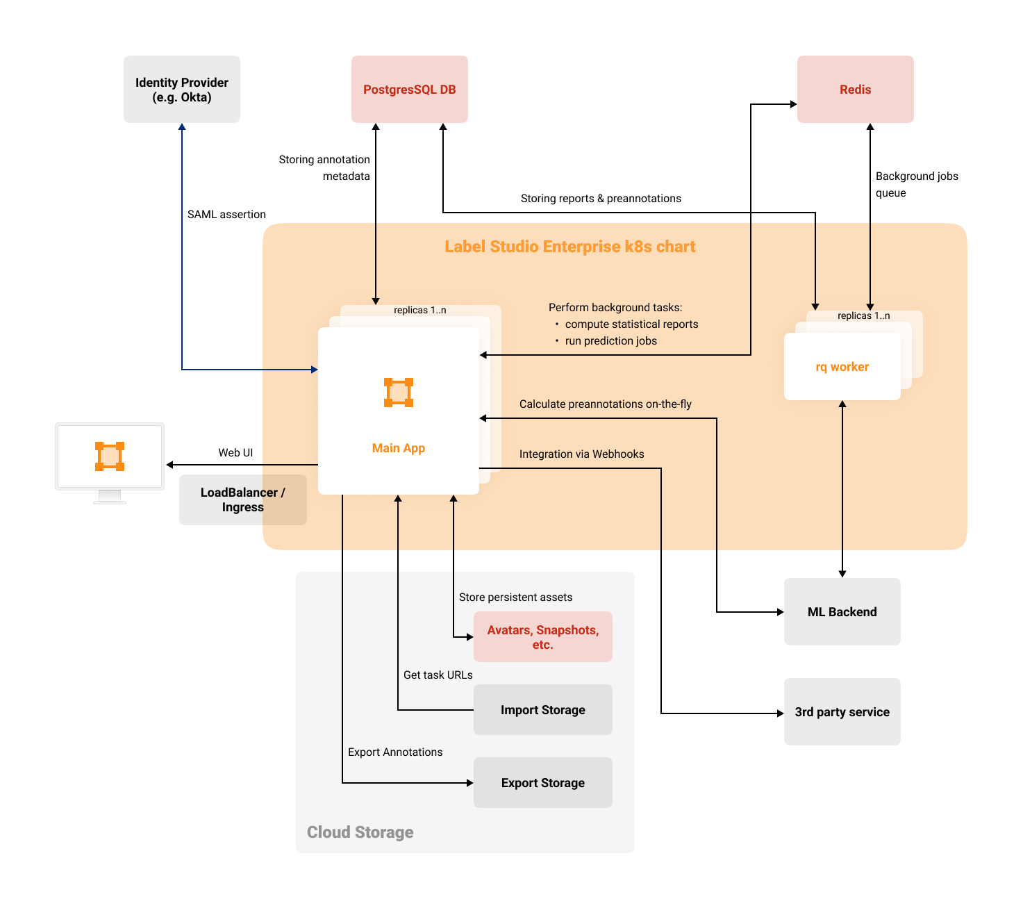 This high-level architecture diagram that outlines the main components of a Label Studio Enterprise deployment.