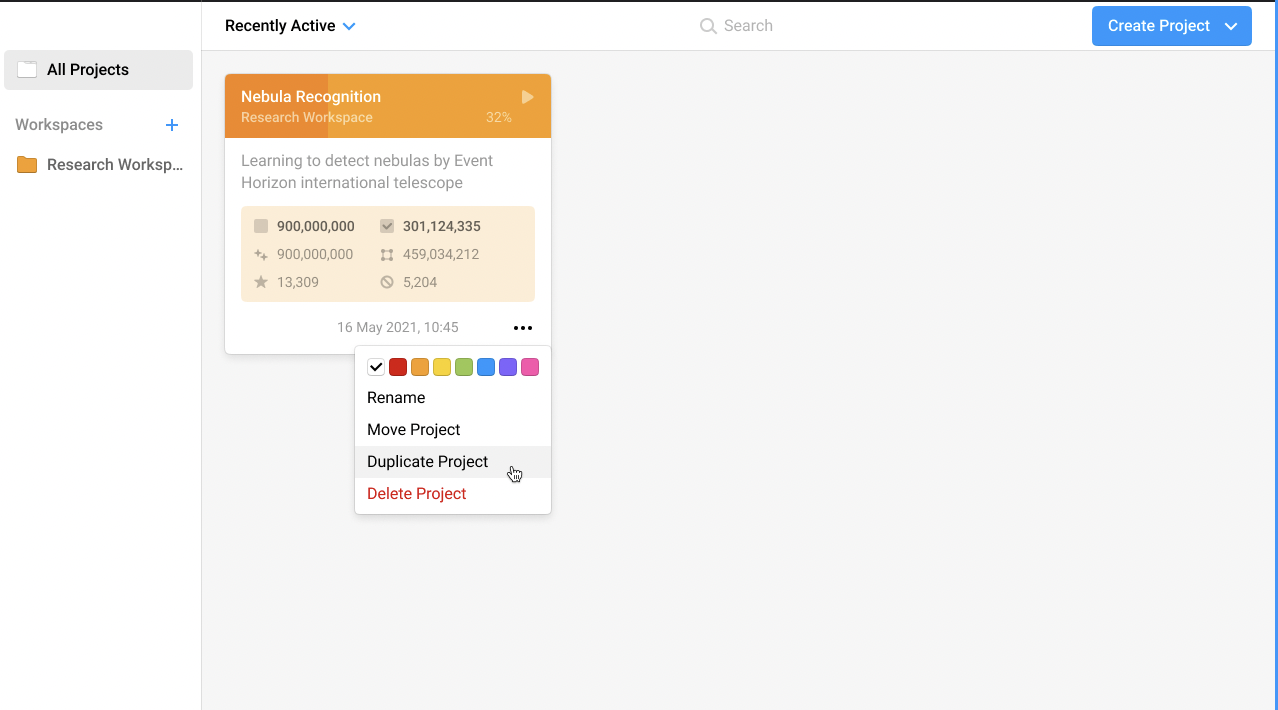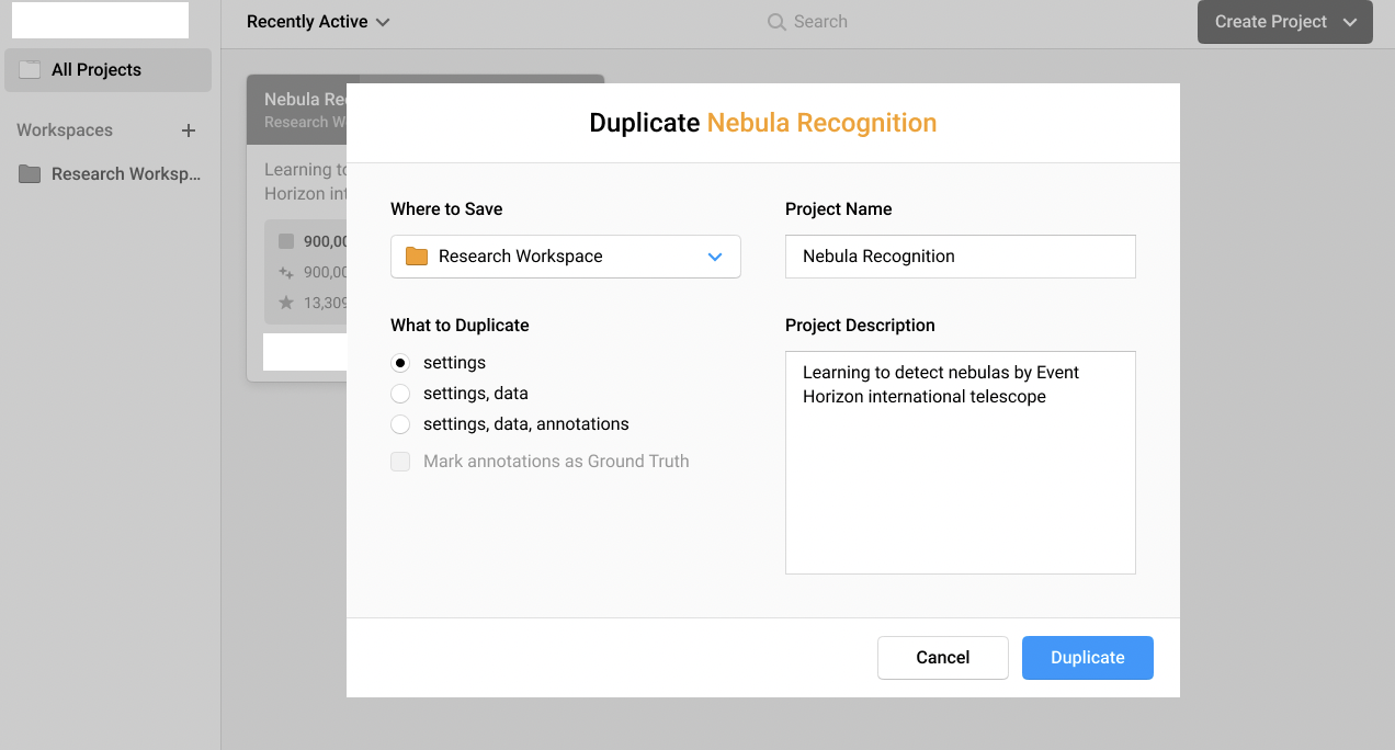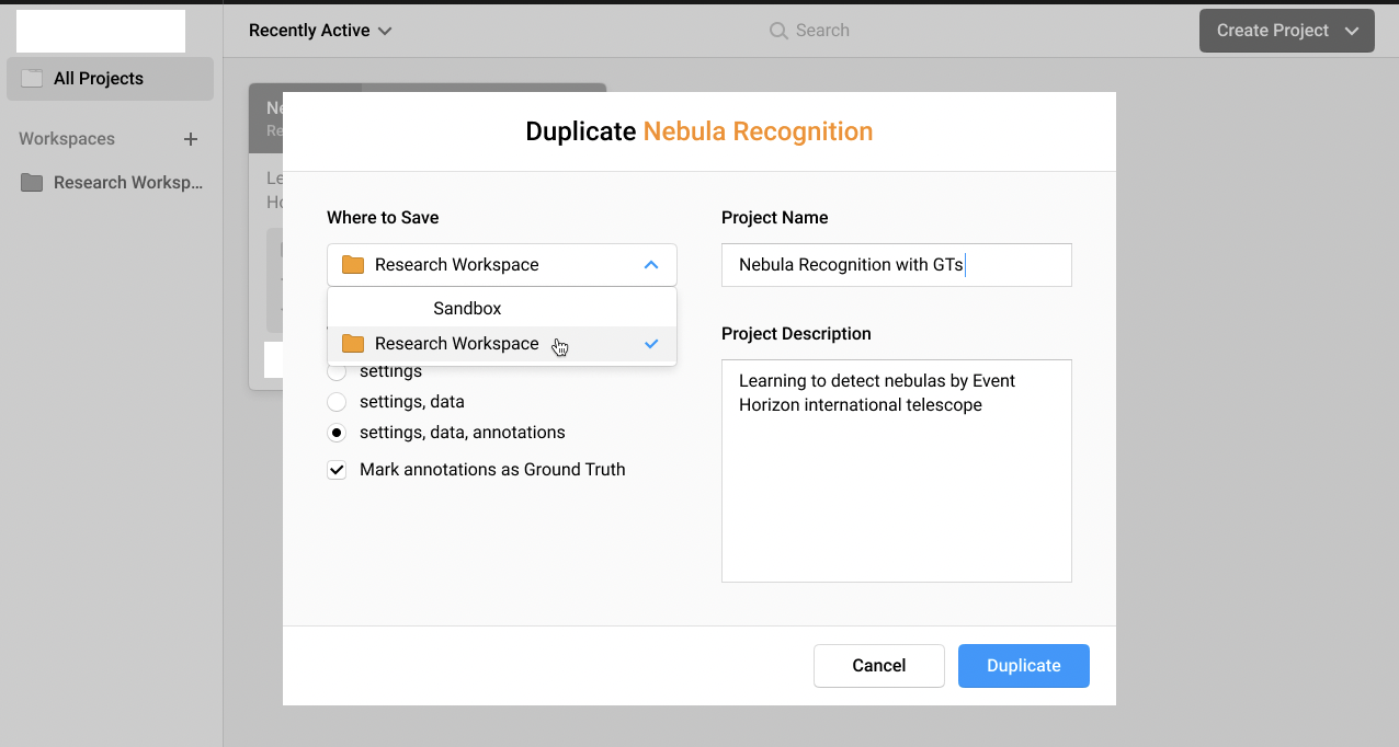 The Duplicate project feature allows you to duplicate projects to a target workspace optionally importing the settings, tasks, and annotations. Duplicate a project by using the Project’s settings or Project card’s more menu (three dots …).