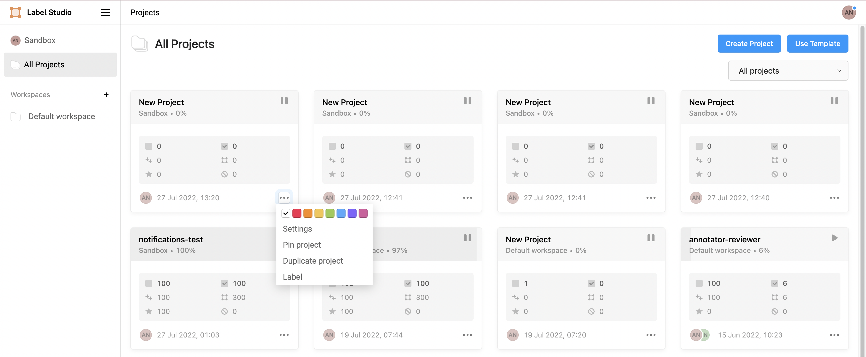 Organize projects into workspaces to make order in labeling data with Label Studio Enterprise.