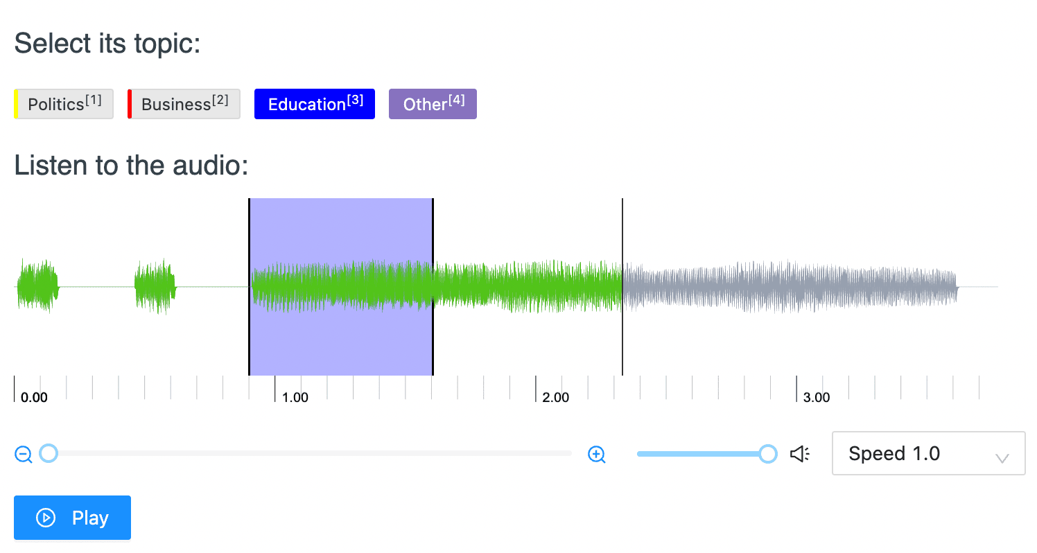 If you want to perform audio classification tasks on specific segments of audio clips, you can use this template to listen to an audio file and classify the topic of the clip.